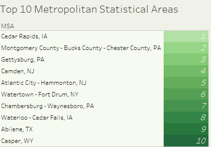 As noted in a recent study by Nationwide, about half of Metropolitan Statistical Areas (MSAs) have a positive ranking, which means that a downturn in housing in highly populated regions is highly unlikely over the next one to two years.