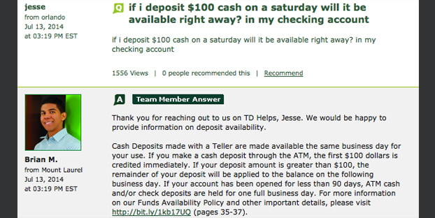 TD Bank’s $100 same-day availability rule only applies to accounts that have been open for 90 days or more.